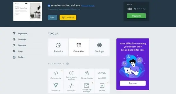 uKit offers a website-building wizard that will guide a new user throughout the process. Take your time, and don’t bypass the guide. In a few steps, you will get a clear image of how to settle a professional-looking site quickly.