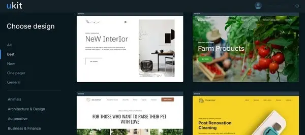 uKit templates are categorized into 40 business niches, from Automotive to Construction, from Education & Training to Farming & Agriculture, etc. Besides, you can filter them by General, One pager, New, and Best options.